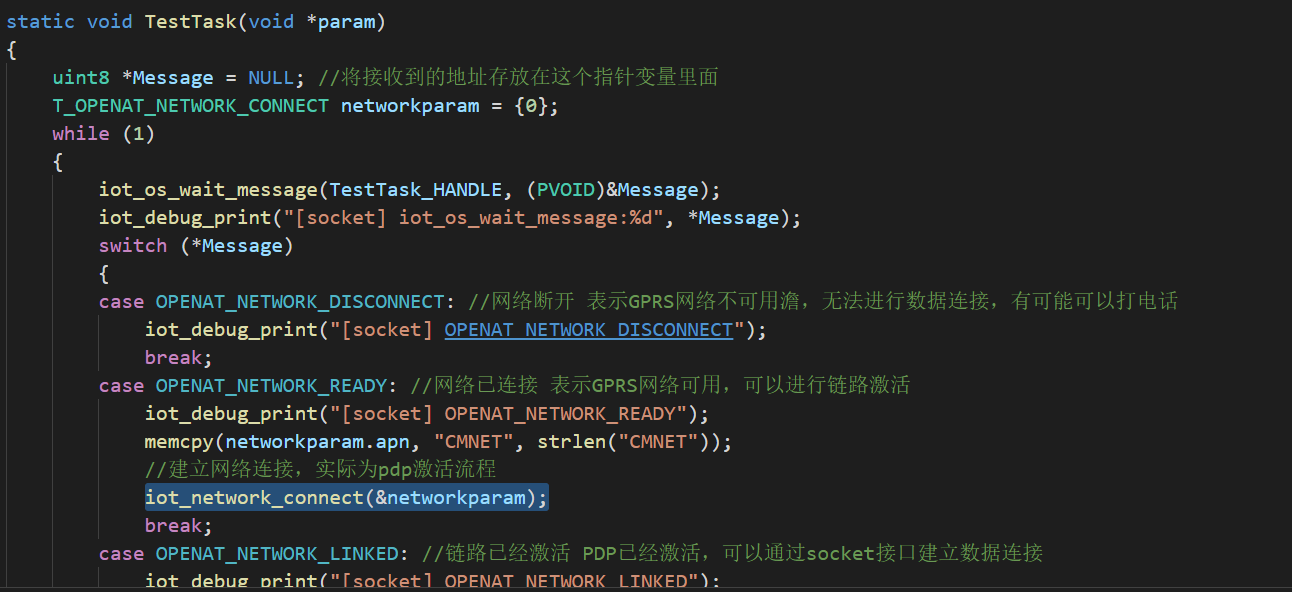 # 目录 [点击这里查看所有博文](https://blog.csdn.net/weixin_44570083/article/details/104285283) 本系列博客所述资料`均来自合宙官方`,并不是本人原创(只有博客是自己写的),csdk只是得到了`口头的允许公开授权`。出于热心,本人将自己的所学笔记整理并推出相对应的使用教程,方面其他人学习。为国内的物联网事业发展尽自己的一份绵薄之力,`没有为自己谋取私利的想法`。若出现侵权现象,请告知本人,本人会立即停止更新,并删除相应的文章和代码。 本系列博客基于紫光展锐的`RDA8910 LTE Cat 1` bis芯片平台开发。理论上适用于合宙的Air720U、Air724U、广和通L610以及安信可的cat-01模块。 各个厂家的部分配置文件可能不一样,也许会导致设备出现奇怪的问题,其他的模块我也不确定能不能用,自行测试。但是有一点`编译下载和监视流程基本一样`,可供参考。 先不管支不支持,如果你用的模块是是紫光展锐的RDA8910,那都不妨一试,也许会有意外收获(`也有可能变砖,慎重!!!`)。 我使用的是`Air724UG`开发板,如果在其他模块上不能用,那也不要强怼,也许是开发包不兼容吧。这里的代码是没有问题的。例程仅供参考! # 一、前言 上篇博客我们简单的使用了下互联网的功能,主要是为了带大家熟悉一下联网流程,必须要根据设备反馈的信息进行相应的处理,才能接入互联网。本篇博客我们一起来试一试怎么使用tcp连接与服务器交换信息。 关于tcp通讯的详解[点击这里](https://blog.csdn.net/sinat_36629696/article/details/80740678),这位大神总结的很好,有兴趣的可以去看看底层原理。原理很复杂我这里也没什么好讲的,我只负责教会大家怎么用。  要记住一点就是tcp通讯是需要建立长连接的,有服务端和客户端的区别。服务端不会主动发起连接请求,只有客户端才会主动向服务器发起连接请求,建立连接后双方均可以主动发送数据。(`注意:这里的服务端是指软件的状态,并不是指远程的服务器`)。 由于我们使用的是4g模块,联网时基站给我们分配的ip不是公网ip。我又没有能力实现在模块上跑一套内网穿透的程序,所以就没有办法测试将模块作为tcp服务端使用的程序,关于tcp的例程只有这一个`TcpClient`,这是一个很大的遗憾。如果用的是wifi模块那就可以在局域网内测试TcpServer。  lwip是瑞典计算机科学院(SICS)的Adam Dunkels 开发的一个小型开源的TCP/IP协议栈。实现的重点是在保持TCP协议主要功能的基础上减少对RAM 的占用。现在嵌入式设备联网所使用的socket库一般都是lwip库,所以不用担心在我这里学会了socket怎么用,去其他地方就不会用了,放心大胆的学,在哪都是一样的。  # 二、编写测试程序 ## 2.1、了解本例程所用到的函数 使用tcp服务需要包含`#include "iot_socket.h""`头文件,我们这里只用到了8个函数,分别是: >/**设置网络状态回调函数 *@param indCb: 回调函数 *@return TRUE: 成功 * FALSE: 失败 **/ * BOOL `iot_network_set_cb` (F_OPENAT_NETWORK_IND_CB indCb ) > /**创建socket *@param domain: 仅支持AF_INET (IPV4 网络协议) @param type: 支持SOCK_STREAM/SOCK_DGRAM,分别表示TCP、UDP连接 @param protocol: 仅支持0 *@return >=0: socket描述符,用于后续操作 * <0: 创建socket失败 *@note 创建的socket不用后需要用close将其关闭 **/ * int `socket`(int domain, int type, int protocol) > /**本地字节顺序转化为网络字节顺序(16bits) *@param n: 本地字节书序数据 *@return 网络字节顺序数据 **/ `htons`(n) ((n & 0xff) << 8) | ((n & 0xff00) >> 8) > /**将ip地址字符串转为数值,转化后的数值为网络字节顺序 *@param cp: ip地址字符串,例如"192.168.1.1" *@param addr: struct in_addr 返回的ip地址数值 *@return 1: 成功 * 0: 失败 **/ `inet_aton`(cp, addr) ipaddr_aton(cp, (openat_ip_addr_t*)addr) > /**建立和服务器端的连接 *@param socketfd: 调用socket接口返回的socket描述符 @param addr: 指定服务器地址和端口 @param addrlen: sizeof(struct openat_sockaddr) *@return 0: 表示成功 * <0 表示有错误 **/ * int `connect`(int socketfd, const struct openat_sockaddr *addr, openat_socklen_t addrlen) > /**关闭socket *@param fd: 调用socket接口返回的socket描述符 *@return 0: 表示成功 * <0 表示有错误 **/ * int `close` (int fd) > /**发送数据 *@param socketfd: 调用socket接口返回的socket描述符 @param msg: 数据内容 @param len: 数据长度 @param flags: 仅支持MSG_DONTWAIT/MSG_OOB,可以通过或来指定多个标志,一般为0 *@return >=0: 实际发送的长度 * <0 发送错误 **/ * int `send`(int socketfd,const void *msg,size_t len,int flags) > /**接收数据 *@param socketfd: 调用socket接口返回的socket描述符 @param buf: 用于存放数据的缓存 @param len: buf的长度 @param flags: 仅支持MSG_DONTWAIT/MSG_PEEK/MSG_OOB,可以通过或来指定多个标志,一般为0 *@return >0: 接收到的数据长度 * =0: 对方已经断开连接 * <0: 读取错误 *@note 当flags没有设置MSG_DONTWAIT,该函数会阻塞,直到有数据或者读取超时 **/ * int `recv`(int socketfd,void *buf,size_t len,int flags) * ## 2.2、编写主程序 主程序负责注册网络回调函数,以及创建一个消息处理函数。 ```c //系统休眠 iot_os_sleep(10000); //注册网络状态回调函数 iot_network_set_cb(NetWorkCb); //创建一个任务 //TestTask_HANDLE = TestTask_HANDLE = iot_os_create_task(TestTask, NULL, 2048, 10, OPENAT_OS_CREATE_DEFAULT, "TestTask"); return 0; ``` ## 2.3、编写网络回调函数 消息回调函数负责通知系统消息,最好不要在其中处理复杂的动作。我这里将系统消息转存到全局变量中,然后再任务中定时查询并处理其他的逻辑。 ```c